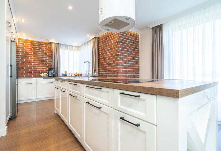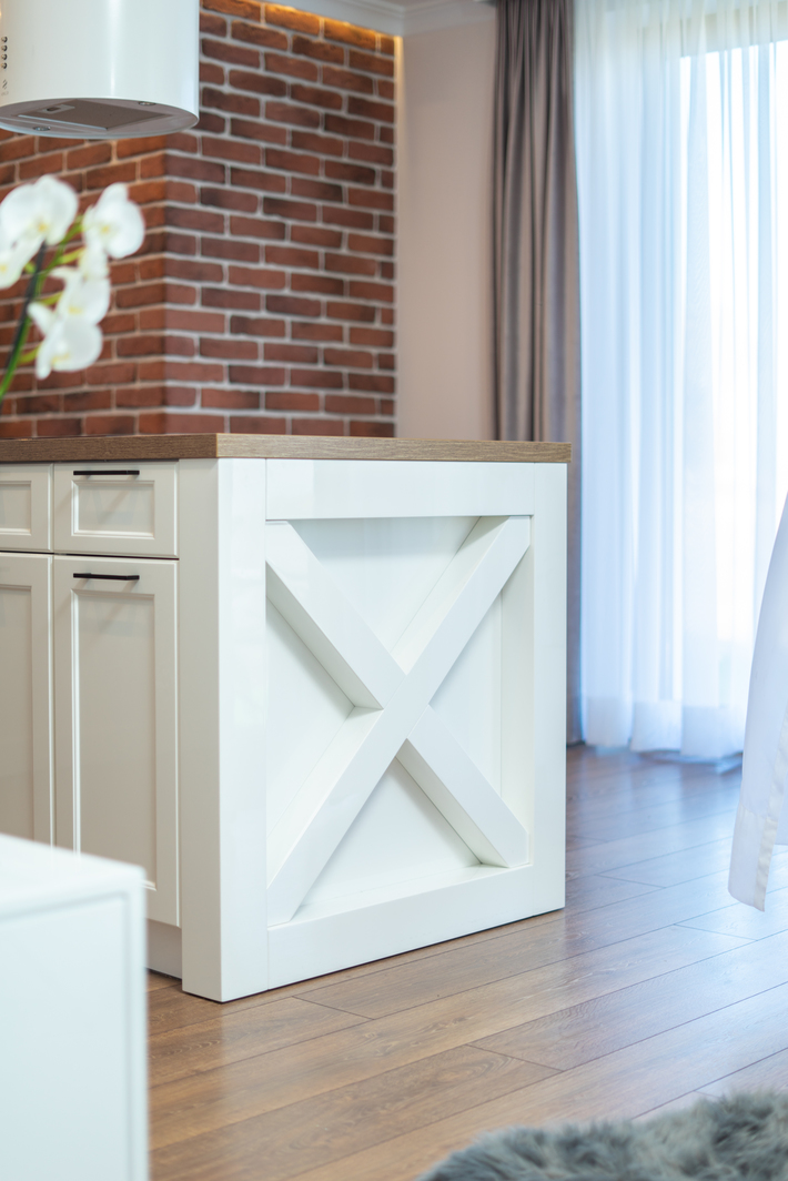Użyte w projekcie blaty firmy Egger rewelacyjnie imitują naturalne drewno dzięki czemu całość, wygląda bardzo efektownie.