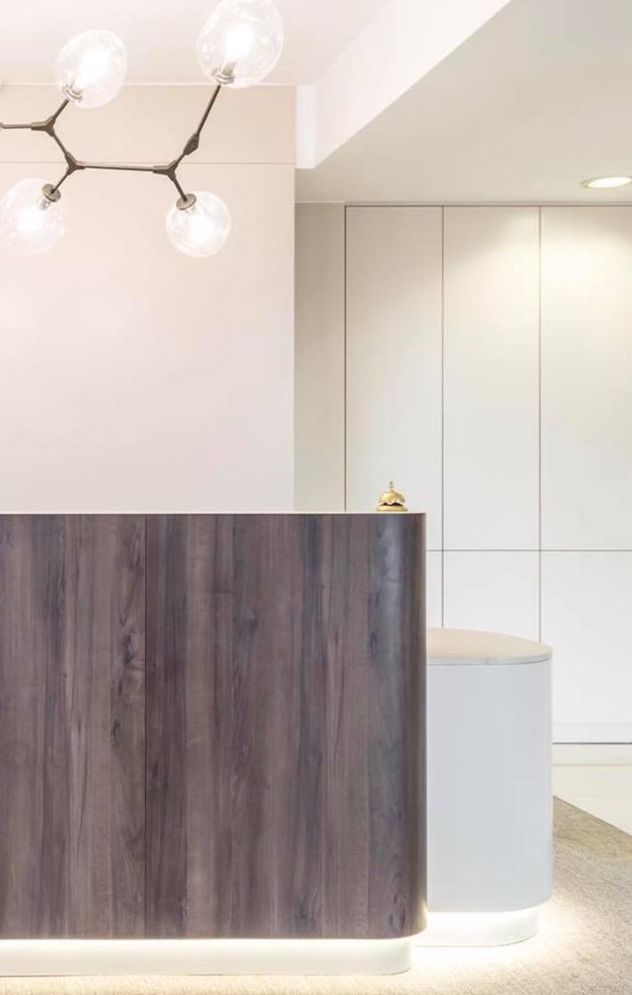 Tym razem przedstawiamy Państwu ladę recepcyjną wykonaną z elementów giętych, zabudowę ściany z płyt lakierowanych a także pojemne szafy na najpotrzebniejsze akcesoria.
